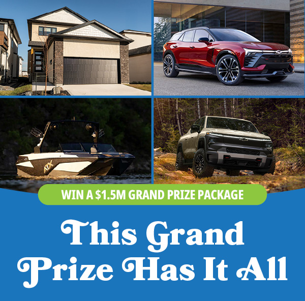 Worth over $1.5 million, this MEGA Grand Prize gives you the keys to a pair of 2026 EVs – the Chevrolet Silverado and Chevrolet Blazer. You’ll spend your summers on the water with a 2026 ATX 22 TYPE‑S boat and trailer. Your new space will be perfectly furnished with a $100,000 Total Home Package from Wiens Furniture. You’ll be free to explore the world with a $100,000 Fareconnect.com travel voucher. And to top it off, you’ll have $200,000 cash to use however you like.