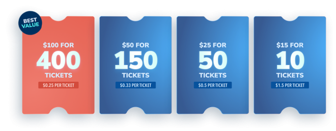 - Tickets cost 2 for $110 / 5 for $200 / 10 for $350 / 25 for $600