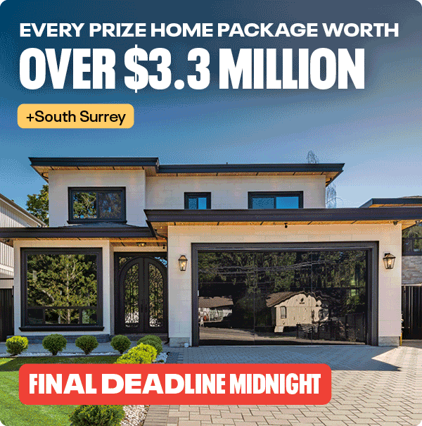 Change your life forever with a $3.3 million home package in Vancouver, Sooke, Kelowna, South Surrey, Courtenay, Burnaby, Colwood or Langley. Each home package comes with incredible extra prizes like cars, travel, furniture or millions in cash.