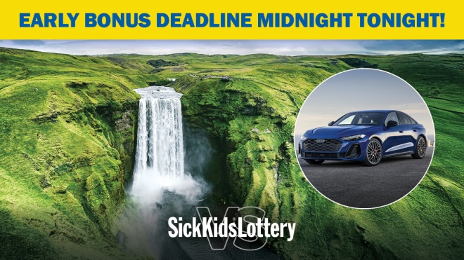 Time is running out! Get your SickKids Lottery tickets before TONIGHT’S MIDNIGHT Early Bonus Deadline for a chance to win a bucket-list prize: an Iceland Adventure and a 2026 Audi S5, or $90,000 cash.