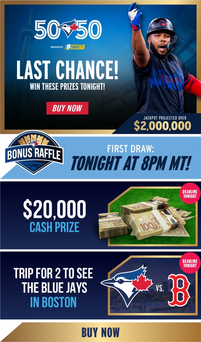 ALBERTA, April 26, 2026 — Time is running out Blue Jays fans! Get your 50/50 tickets right now and tonight you could win a $20,000 cash prize and a trip to see the Blue Jays take on the Red Sox in Boston! Plus, you’ll also have a chance to win the grand prize jackpot, which is projected to surpass $2,000,000!