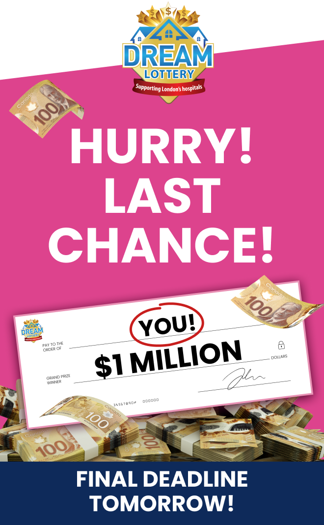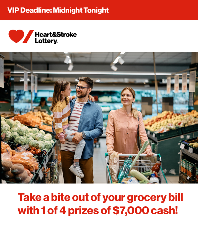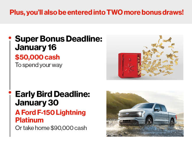 Buy your tickets before Thursday, November 27, 2025 at 1:59 p.m. to be entered in all remaining draws, including the JACKPOT.