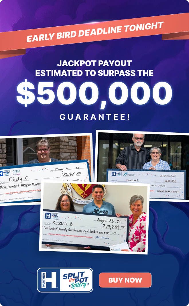 ONTARIO, September 24, 2025 — Tonight’s your last chance in the September Split the Pot Lottery! Get your tickets before 11:59pm — the Jackpot is already at $425,000 and still climbing. Split the Pot Lottery is unique because we have 13 Grand Prize winners every month! Every ticket sold helps 82 hospital and healthcare foundations across Ontario, fund essential healthcare programs and initiatives close to home.