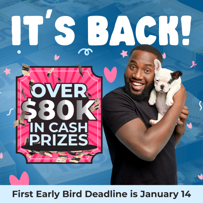 Enter before January 14 to be in the running for the first $2,500 Early Bird prize. Your main draw ticket gives you a shot at the $50,000 grand prize, more chances to win through Early Bird draws, and access to the 50/50 add-on.