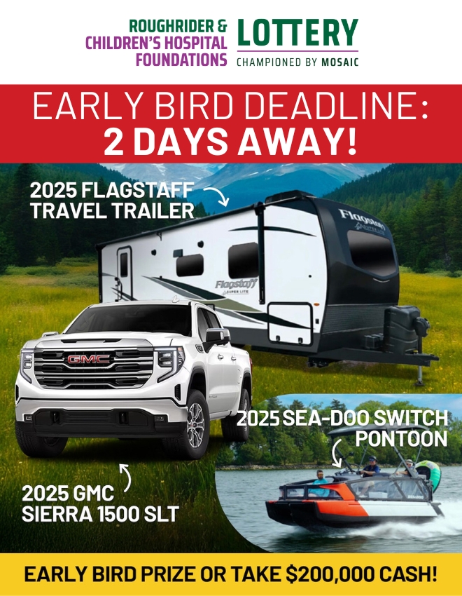 SASKATCHEWAN, September 10, 2025 — There’s only 2 days left before the Early Bird deadline in the Roughrider & Children’s Hospital Foundations Lottery.