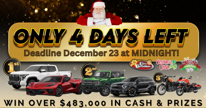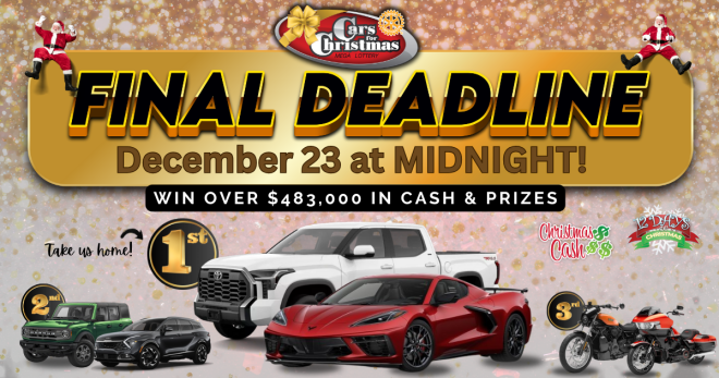 GRANDE PRAIRIE, ALBERTA, Tuesday, December 23, 2025 — This is the last chance to win a BRAND NEW pair of vehicles in the 2025 Cars for Christmas Mega Lottery. Deadline ends at midnight tonight! Don’t miss out on a chance at the BEST Christmas EVER! Tickets start at only $85 and available at https://www.carsforchristmas.com/ or call toll free 1-888-217-1888.