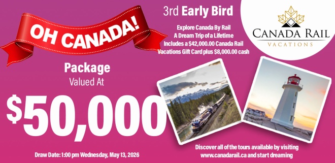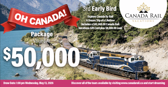 ALL ABOARD! Enter now for your chance to WIN a $50,000 Oh Canada Package which includes a $42,000 Gift Card from Canadarail.ca PLUS $8,000 CASH! Explore Canada in style aboard Via Rail’s the Canadian and the Rocky Mountaineer.