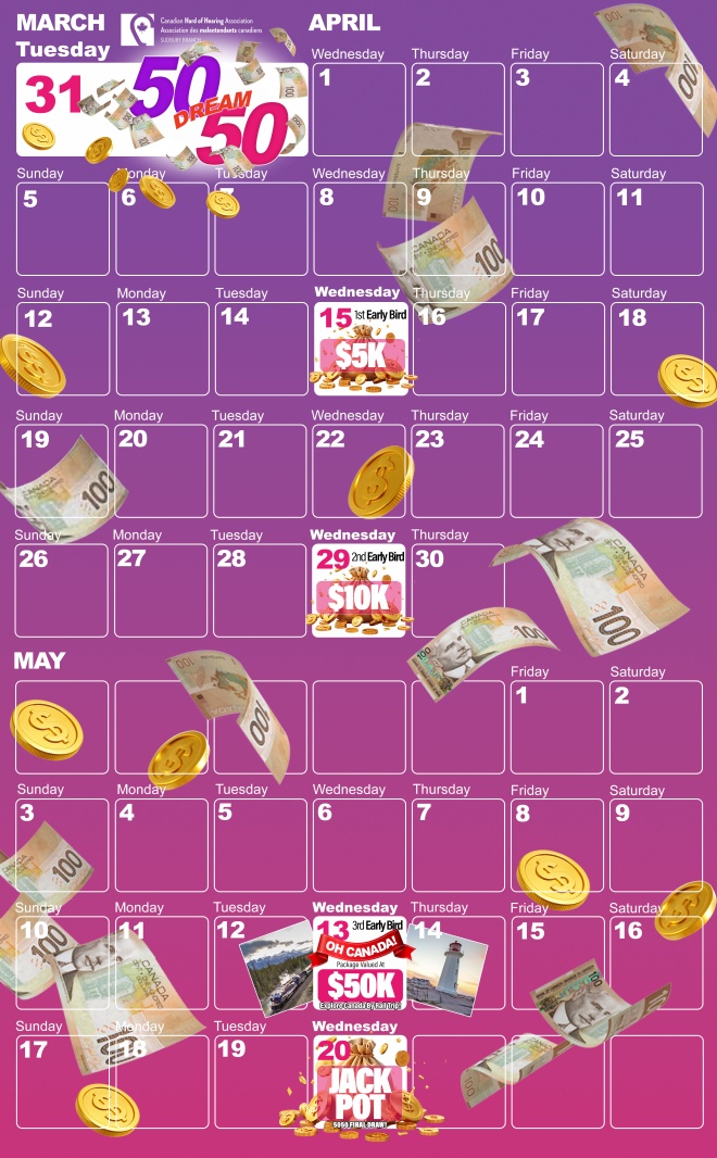The 50/50 Dream Lottery is offered by the Canadian Hard of Hearing Association, Sudbury Branch  at 435 Notre Dame Ave., Suite 101, Sudbury, ON P3C 5K6.  Telephone (705) 523-5695. The 50/50 Dream Lottery License No. RAF1537619. Charitable Registration Number 879071413