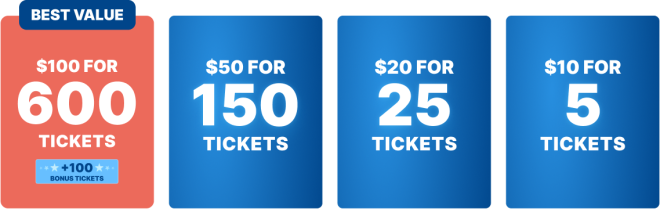Get more bang for your buck with bonus tickets this month. At the $100 tier you get 600 tickets plus 100 bonus entries – that’s just $0.14 per ticket!