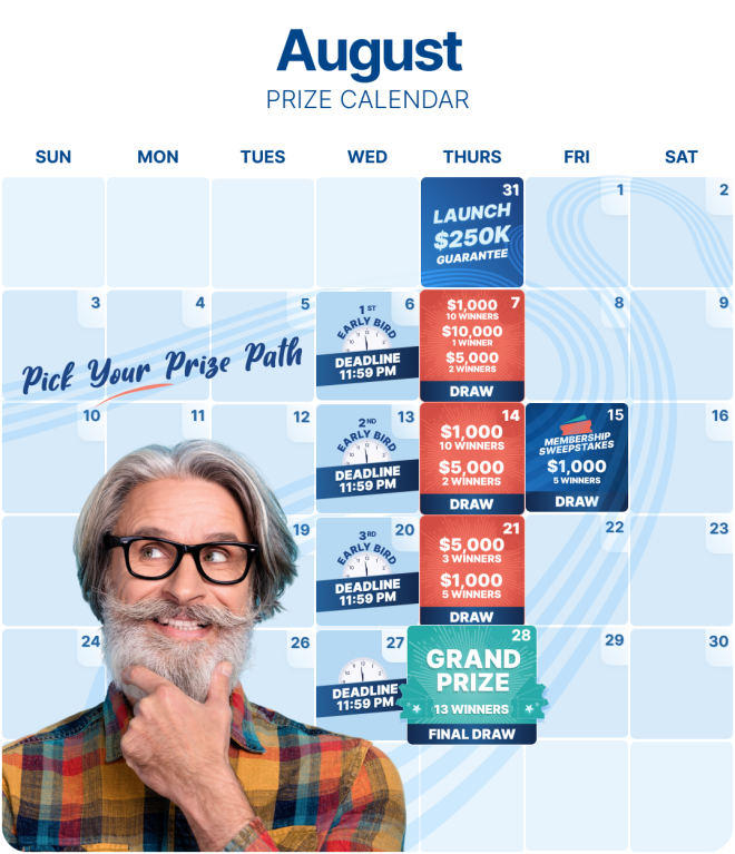• Final Deadline: Wednesday, August 27 at 11:59 PM, 13 lucky winners will share the final Jackpot Payout – guaranteed at $250K, with a whole month to grow way beyond that!