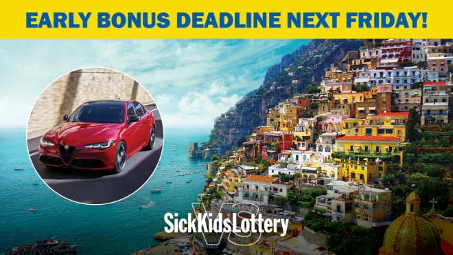 Get your SickKids Lottery tickets before Friday, September 12 and you’ll be entered to win the Early Bonus Prize – an Amalfi escape and an Alfa Romeo. You could choose between a once-in-a-lifetime trip to Italy and the keys to a new Italian ride or $90,000 cash to spend however you like.